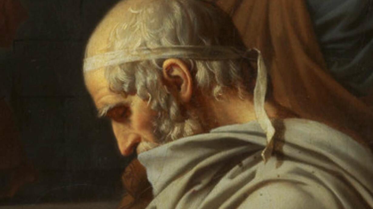 The cover art for this episode is Plato as depicted in a portion of the oil painting The Death of Socrates, which French painter Jacques-Louis David completed in 1787.