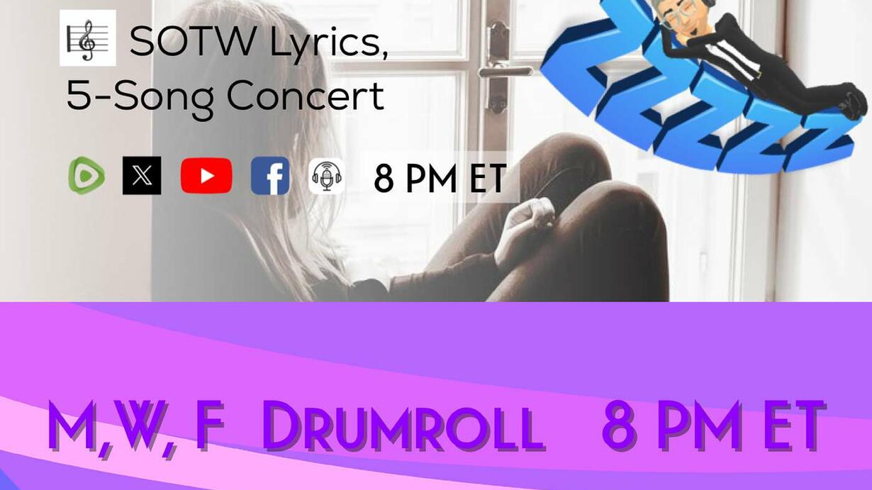 LIVE Drumroll happens right here every Monday, Wednesday, and Friday, at 8 PM Eastern. Monday’s Drumroll, introduces the Song of the Week's title and lyrics. Wednesday will feature the song's backstory, and Friday covers its scripture references. I'll finally release the Song of the Week during Sunday Jam as the 15th song, ending the, 8-9 AM, "getting ready for church, Church Prep" concert. The Monday, Wednesday, Friday shows include playing 5 of the 15 songs from the previous week. Please keep track of your favorite songs. I'm releasing 120 songs in a 3-year window. Free-Download the mp3 demos and lyric sheets at mwdhq.com. LIVE Weekday Drumroll shows are interactive with the audience. Sunday Jam will have no chit-chat, simply, solemn Church Prep.