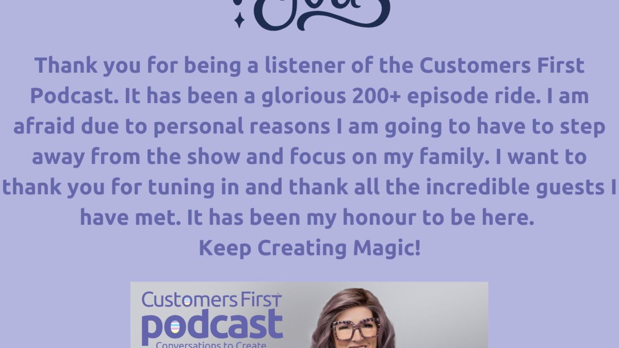 Due to personal reasons, I will be stepping away from Customers First & the podcast to focus on my family. I want to thank you all for your loyalty and support you have shown me over the last 4 years, and I am forever grateful to each and every one of you. After today, there will be no new content being posted for an undetermined period of time. I ask that you respect our privacy during this time.