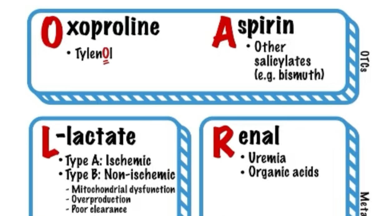 • Oxoproline → Chronic acetaminophen (Tylenol) use, often in malnourished patients