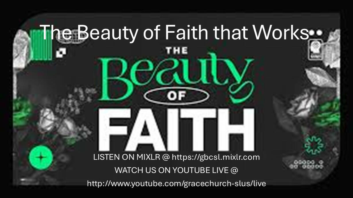 The Beauty of Faith that Works LISTEN ON MIXLR @ https://gbcsl.mixlr.com WATCH US ON YOUTUBE LIVE @ http://www.youtube.com/gracechurch-slus/live James 2:14-26 ESV 14 What good is it, my brothers, if someone says he has faith but does not have works? Can that faith save him? 15 If a brother or sister is poorly clothed and lacking in daily food, 16 and one of you says to them, “Go in peace, be warmed and filled,” without giving them the things needed for the body, what good is that? 17 So also faith by itself, if it does not have works, is dead. 18 But someone will say, “You have faith and I have works.” Show me your faith apart from your works, and I will show you my faith by my works. 19 You believe that God is one; you do well. Even the demons believe—and shudder! 20 Do you want to be shown, you foolish person, that faith apart from works is useless? 21 Was not Abraham our father justified by works when he offered up his son Isaac on the altar? 22 You see that faith was active along with his works, and faith was completed by his works; 23 and the Scripture was fulfilled that says, “Abraham believed God, and it was counted to him as righteousness”—and he was called a friend of God. 24 You see that a person is justified by works and not by faith alone. 25 And in the same way was not also Rahab the prostitute justified by works when she received the messengers and sent them out by another way? 26 For as the body apart from the spirit is dead, so also faith apart from works is dead. Two Pictures of Faith Dead Faith Does not save. Does not bear fruit. Does not care for the poor. Living Faith Does save. Does bear fruit. Does care for the poor. Two Pictures of Works Works we do in order to earn favor before God. Works we do as the fruit of faith in God. Faith creates works. Works complete faith. Two Takeaways from God’s Word By faith in Jesus, we have the indescribable privilege of friendship with God. Because of faith in Jesus, we passionately work on behalf of people in need. Grace Baptist Church Podcast HTTPS://PODPOINT.COM/GRACE-BAPTIST-CHURCH-OF-SECOND-LIFE-PODCAST WEBSITE https://gracebaptistofsecondlife.godaddysites.com