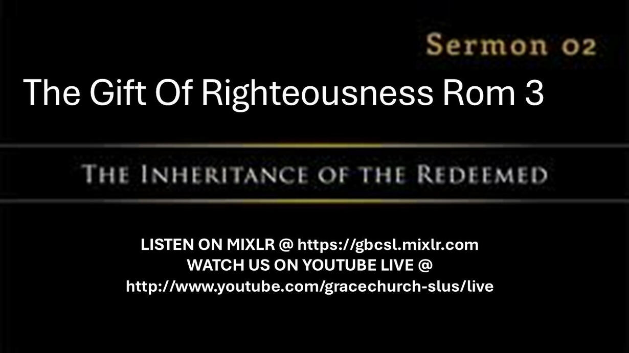 The Gift Of Righteousness Rom 3 LISTEN ON MIXLR @ https://gbcsl.mixlr.com WATCH US ON YOUTUBE LIVE @ http://www.youtube.com/gracechurch-slus/live I. Characteristics of this gift 1 It’s a free gift 2 It is a perfect gift 3 It’s a permanent gift 4 It is a sanctifying gift II Implications of this Gift v. 26 It was to show his righteousness at the present time, so that he might be just and the justifier of the one who has faith in Jesus. V 27 Then what becomes of our boasting? It is excluded. By what kind of law? By a law of works? No, but by the law of faith V 28 For we hold that one is justified by faith apart from works of the law. 29 Or is God the God of Jews only? Is he not the God of Gentiles also? Yes, of Gentiles also, 1 I cannot save myself. My works do not contribute to my salvation. 2 God doesn’t expect me to or think I can. 3 Jesus paid it all for those who believe. Grace Baptist Church Podcast HTTPS://PODPOINT.COM/GRACE-BAPTIST-CHURCH-OF-SECOND-LIFE-PODCAST WEBSITE https://gracebaptistofsecondlife.godaddysites.com