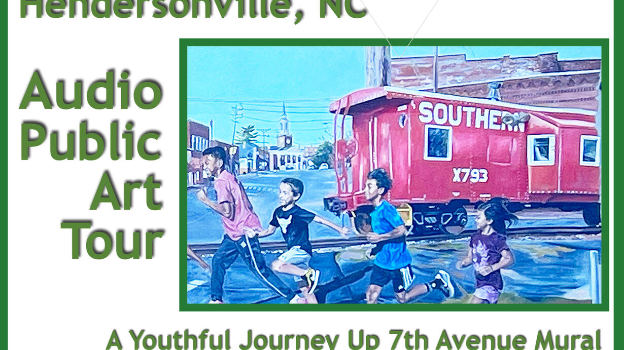 Welcome to the Hendersonville, NC Audio Public Art Tour. This features the mural titled, “Youthful Journey Up 7th Avenue,” located at 628 7th Avenue East. It is a tribute to this historic 7th Avenue district and the people who live in the community. It was created and painted by Billy Smith, an accomplished artist from Brevard, NC. Billy has painted murals all over Western NC. He is the president of the Transylvania County Arts Council, the county where Brevard is located. Listen as he describes the inspiration for the mural and the meaning of each of the elements in it.