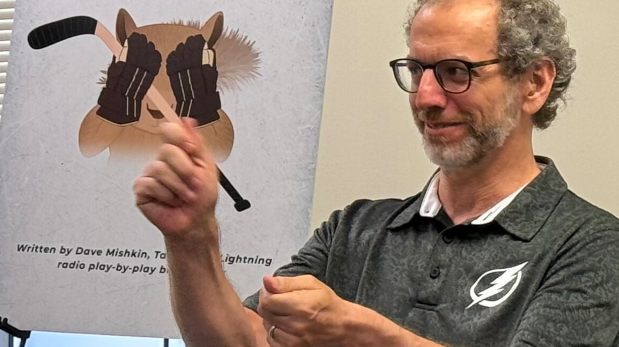 Preseason warm-up skate with the Lightning radio voice, Dave Mishkin, who published his first novel. The Blind Squirrel book is available online and at local stores.