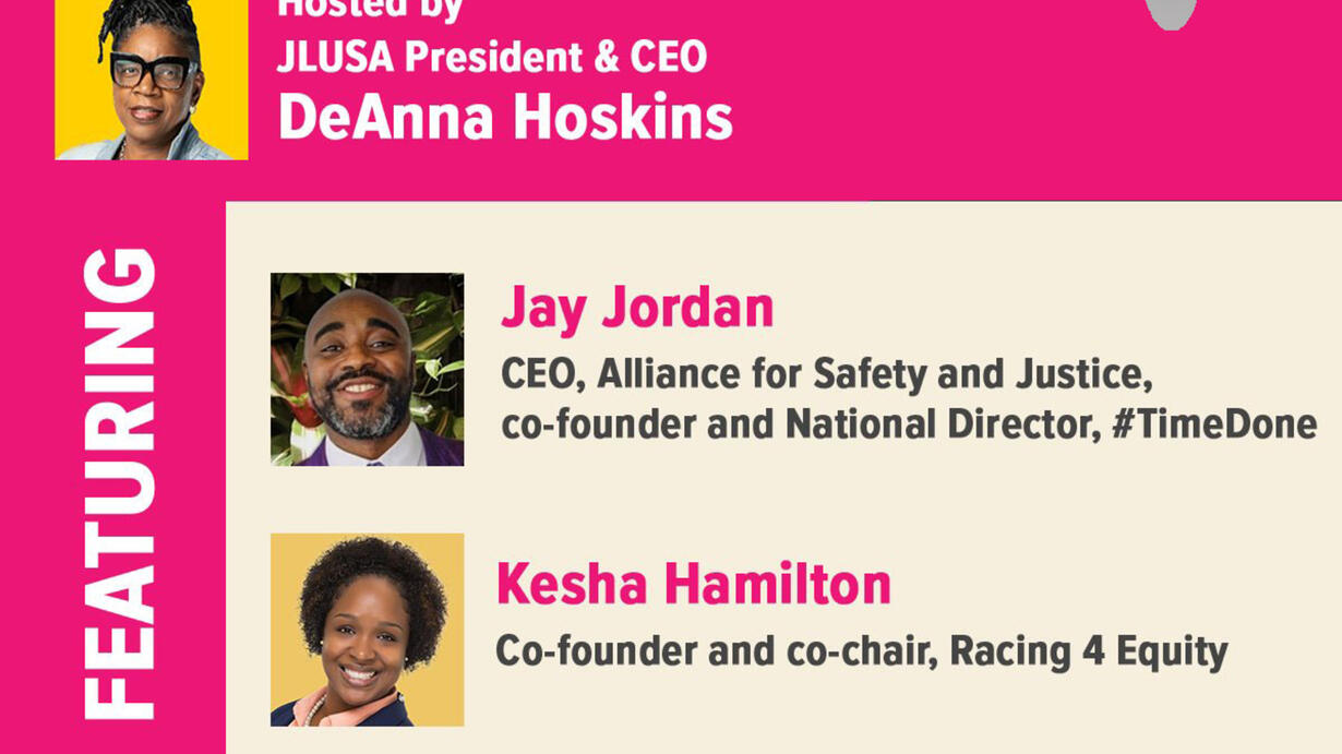 JLUSA President and CEO DeAnna Hoskins hosts a conversation with guests — Jay Jordan, CEO of Alliance for Safety and Justice and co-founder and National Director of #TimeDone; Kesha Hamilton, co-founder and co-chair of Racing 4 Equity; and Kyle D. Bacon, criminal legal reform activist and JustUS Coordinating Council steering committee member — on how they’re making history now as directly impacted leaders working to dismantle racist and oppressive systems.