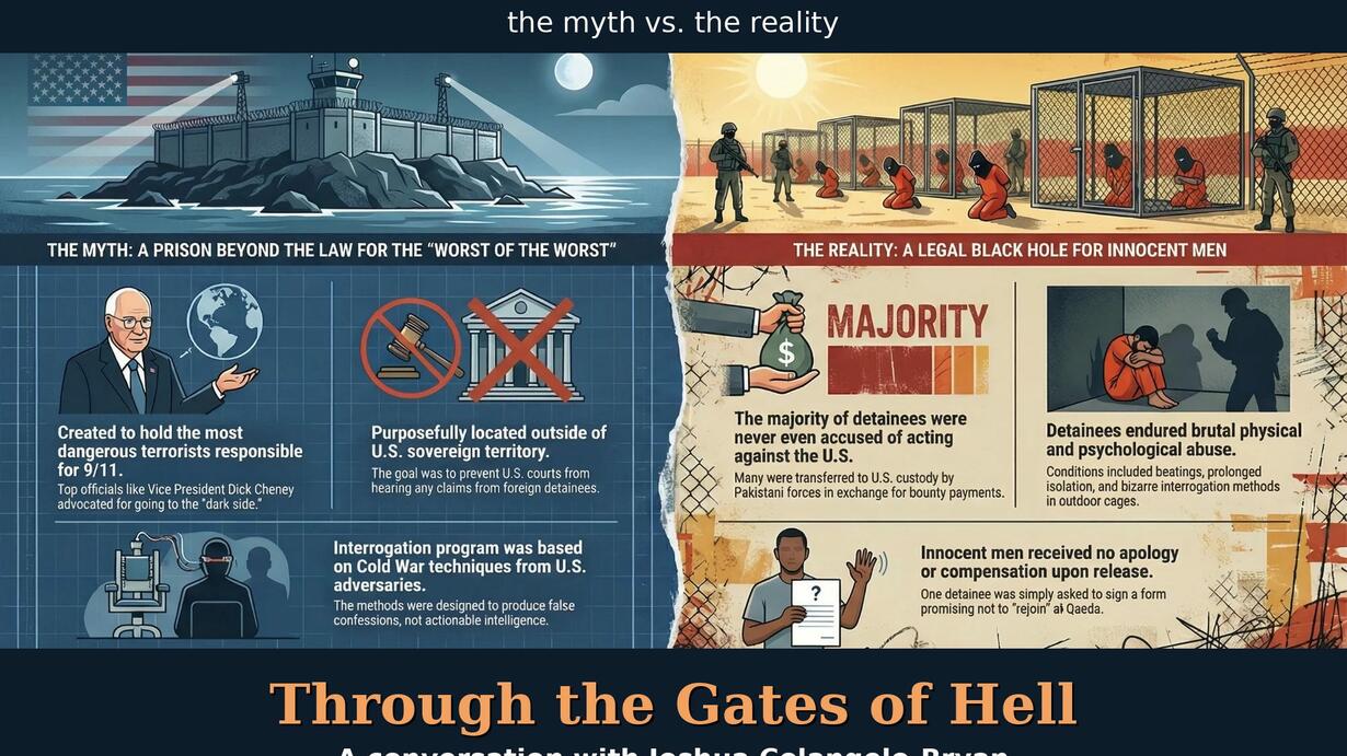 Dick Cheney died four weeks ago, but his dark legacy lives on—quite literally—at Guantanamo Bay. The human rights lawyer Joshua Colangelo-Bryan was among the first attorneys to enter the notorious prison in 2004, and what he found there shattered every official justification for its existence. The “worst of the worst”? Most detainees were never even accused of acting against America. Many were simply sold to the Americans for bounties. The sophisticated interrogation program? Techniques copied from Chinese and Soviet methods designed to extract false confessions, not intelligence. In his new book Through the Gates of Hell, Colangelo-Bryan tells the story of his unlikely friendship with Jaber Mohammed, a Bahraini detainee who spent years in captivity for the crime of being an Arab man in the wrong place (Afghanistan) at the wrong time (post 9/11). Released without apology or compensation—just a form asking him not to “rejoin” organizations he’d never belonged to—Jaber now lives in Saudi Arabia with four children, focusing less on bitterness and more on those rare moments when American guards showed him unexpected kindness. As the Trump administration revives the “worst of the worst” rhetoric against immigrants and once again sends people to Guantanamo, Colangelo-Bryan’s account is a warning from recent history: demonize a racial or religious group, and you will inevitably destroy innocent lives. The gates of hell have once again been opened. Will they ever be closed?