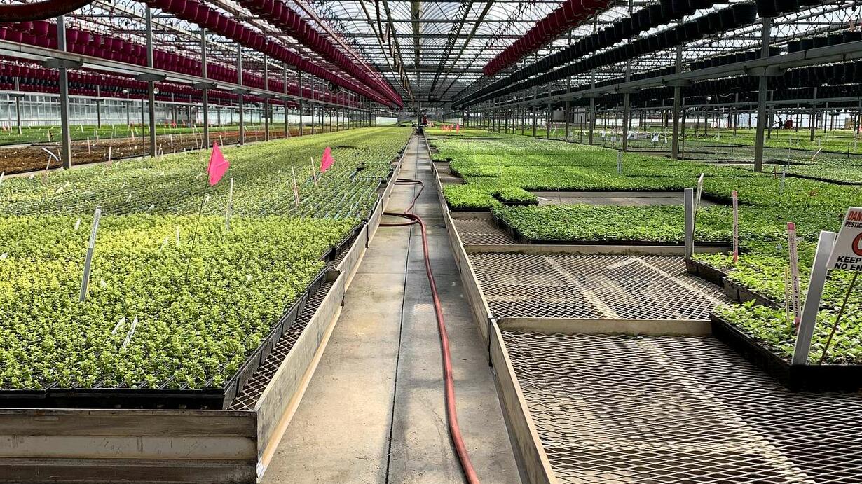 Image: Spring plants and hanging baskets are nearing readiness for shipment from Metrolina Greenhouses. The hanging baskets are currently undergoing automated watering on a conveyor system. Photo by Krystal Snyder