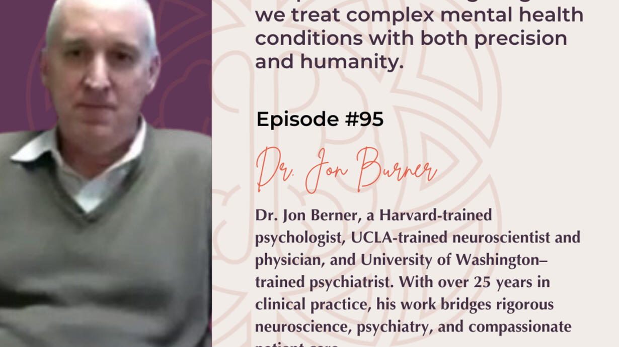 Dr. Jon Berner, a Harvard-trained psychologist, UCLA-trained neuroscientist and physician, and University of Washington–trained psychiatrist. With over 25 years in clinical practice, his work bridges rigorous neuroscience, psychiatry, and compassionate patient care. Dr. Berner’s publications span from the cognitive effects of cocaine and memory in schizophrenia to pioneering treatments with ketamine, rapamycin, and novel metabolomic approaches for mood and pain disorders. He brings a unique lens—uniting neural networks, biochemistry, and clinical psychiatry—to reimagine how we treat complex mental health conditions with both precision and humanity.