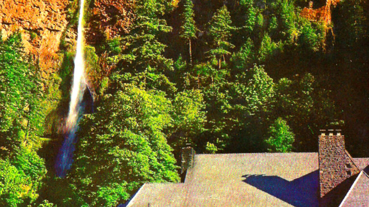 Original owners of the falls tried for years to log it, but the steamship and railroad moguls were making a lot of money on excursion trips, so they blocked the scheme, preserving the falls for today's park. (Columbia River Gorge, Multnomah County; 1890s, 1900s) (For text and pictures, see https://offbeatoregon.com/1707e.fight-for-multnomah-falls-454.html)