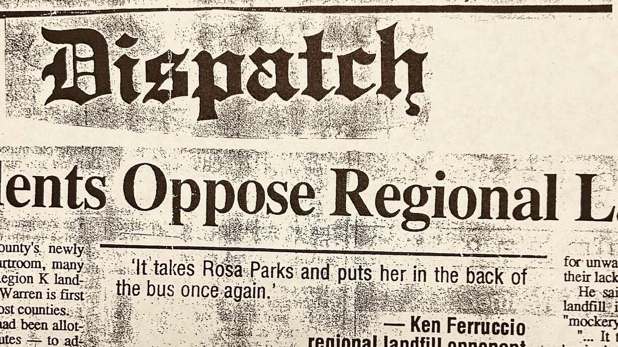 Above Photo: “Warren Residents Oppose Regional Landfill," front-page, Henderson Daily Dispatch,” by Scott Ragland, March 19, 1992. Inset reads: “It takes Rosa Parks and puts her on the back of the bus once again.” Ken Ferruccio
