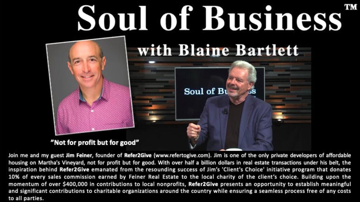 Join me and my guest Jim Feiner, founder of Refer2Give (www.refertogive.com). Jim is one of the only private developers of affordable housing on Martha's Vineyard - not for profit but for good. With over half a billion dollars in real estate transactions under his belt, the inspiration behind Refer2Give emanated from the resounding success of Jim’s 'Client's Choice' initiative program that donates 10% of every sales commission earned by Feiner Real Estate to the local charity of the client’s choice. Building upon the momentum of over $400,000 in contributions to local nonprofits, Refer2Give presents an opportunity to establish meaningful and significant contributions to charitable organizations around the country while ensuring a seamless process free of any costs to all parties.