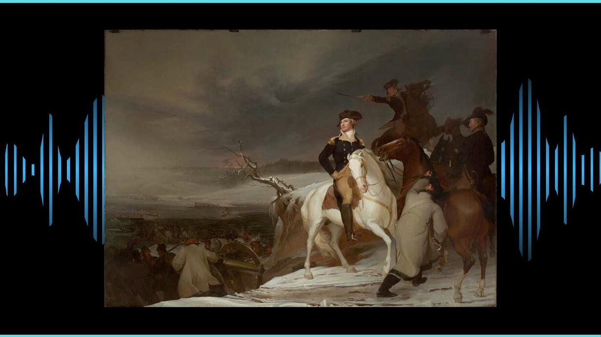 Of the two epically scaled paintings of George Washington’s Delaware crossing, by far the most recognizable is Washington Crossing the Delaware by German-born, Philadelphia-raised Emanuel Leutze. This theatrical 1851 painting (measuring roughly 21 x 12 ft.) hangs today at the Metropolitan Museum of Art. Its charismatic Washington commands the prow of the boat as around him the diverse peoples drawn into his orbit and the cause he represents struggle together in that cause. The lesser known 1819 painting (measuring 17 x 12 ft.) by Thomas Sully depicts an illuminated Washington astride a white mount with the night sky brooding above him and snow and mud churning below. A lone twisted and blighted tree encapsulates the desolation of the revolutionary movement in December 1776. In both paintings, the centerpiece is Washington himself, already the object of a triumphal American mythology, but on that Christmas night in the year of independence, the contest was far from won, and the outlook was desperate.