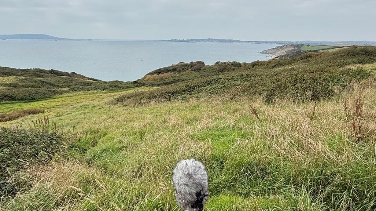 Idling ships upon the bay, moving windsurfers upon the bay, my travelling companion and good friend Al laying in the grass making some art and chatting to the walkers on the path, restarting the recording as there was a hum, a hiking couple, hiking man craning his neck to have a look from 200m away, I’m suddenly self conscious about my choice of bright jumper in an overcast scene, must buy green, grasses are my favourite plant as they evoke summer, a wildness and understated strength and resilience. Chitter chatter in the hillside habitat, two hikers descending the path next to where I am sat, a young couple in urban gear, a coach coming down the lane at the top of the hill, the steely blue of Weymouth Bay scratched by the wake of a small fishing boat, a man with binoculars, in this unfamiliar place I’m mostly noticing surface activities and fixtures and not engaged with or thinking about deeper considerations, accepting it more on face value than underlying narratives or other social contexts, which is how we might look at a painting, for its composition, materials or techniques, but of course it was made within, or maybe influenced by the socio-economic or political climate at the time, the coach returning back up the lane, a ship starting its engine, Portland. The sighting of one bird by one person at one place at one time with millions of years of evolution of different strands and billions of potential probabilities happen, and then it was gone in a second, a man noticing that I have headphones on, a beam of sunlight on the water, the active society of birds, a hiking party some of whom are not wearing blue, some fast 4/4 beats (135bpm) from car on the lane, more light making its way through the clouds and defining a difference between the sky and there sea, anxiously waiting tpfor the hour signal from my friend. Birds identified are Skylark, Wren, Meadow Pipit, Greenfinch, Pheasant, Blackbird, Siskin, Long Tailed Tit, Goldcrest, Dunnock, Pied Wagtail, Cetti's warbler, Robin, Linnet and Goldfinch.