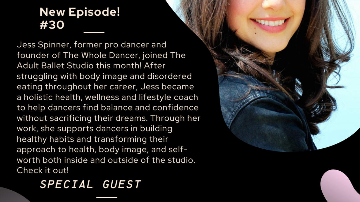 Jess Spinner, former pro dancer turned health, wellness and lifestyle coach for dancers, is in the studio this month! She’s the founder of The Whole Dancer - a platform where she seeks to transform the way dancers approach health, body image, and self-worth both inside and outside of the studio.