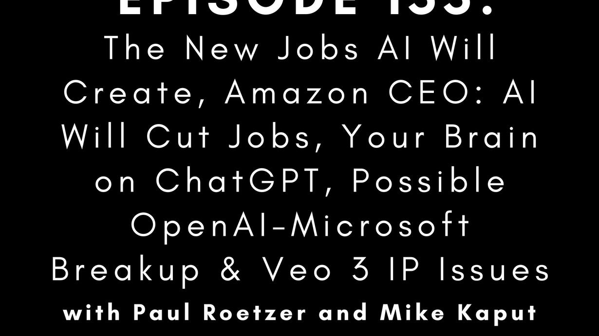 This week, Paul and Mike unpack the New York Times’ list of 22 upcoming roles (from “AI auditors” to “personality directors”), weigh Andy Jassy’s memo that generative AI will mean leaner teams, and dissect the viral MIT study about what ChatGPT might be doing to your brain. Rapid-fire hits include Meta’s billion-dollar talent raid, Apple’s rumored Perplexity bid, and fresh OpenAI-Microsoft friction. Show Notes: Access the show notes and show links here Timestamps:  00:00:00 — Intro 00:05:41 — The New Jobs AI Could Create 00:26:11 — Amazon CEO on AI Job Disruption and AI Underemployment 00:39:28 — Your Brain on ChatGPT 00:52:22 — Fallout from the Meta / Scale AI Deal 00:55:27 — Meta and Apple AI Talent and Acquisition Search 01:05:59 — The OpenAI / Microsoft Relationship Is Getting Tense 01:08:53 — Veo 3’s IP Issues 01:12:09 — HubSpot CEO Weighs In on AI’s SEO Impact 01:15:29 — The Pope Takes on AI 01:18:39 — AI Product and Funding Updates This week’s episode is brought to you by MAICON, our 6th annual Marketing AI Conference, happening in Cleveland, Oct. 14-16. The code POD100 saves $100 on all pass types. For more information on MAICON and to register for this year’s conference, visit www.MAICON.ai. This episode is also brought to you by our upcoming AI Literacy webinars. As part of the AI Literacy Project, we’re offering free resources and learning experiences to help you stay ahead. We’ve got two live sessions coming up in June—check them out here. Visit our website Receive our weekly newsletter Join our community: Slack LinkedIn Twitter Instagram Facebook Looking for content and resources? Register for a free webinar Come to our next Marketing AI Conference Enroll in our AI Academy