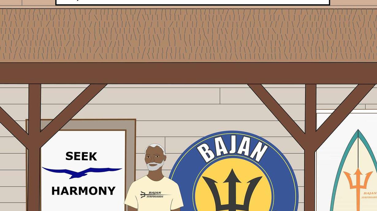-Art walks into Bajan Surfboards where he meets Joe Montgomery, the owner of the surf shop. Joe is one of many proud Black Surfers who originates from the island of Barbados.