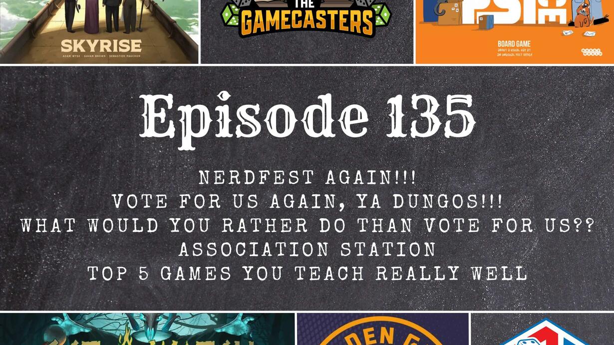 Hey there, Gamers! Welcome back to Episode 135 of The Gamecasters Podcast. In tonight's episode we recap Nerdfest 2024, we talk about the golden geek nomination for best podcast that we have! Please vote for us over at boardgamegeek.com!! Jeff talks about what our listeners would rather do than vote for us in the Instagram Inbox and friend of the show Chris Wilson takes Ryan and Natalie through an Association Station and then we end the show with our Top 5 Games You Teach Really Well.