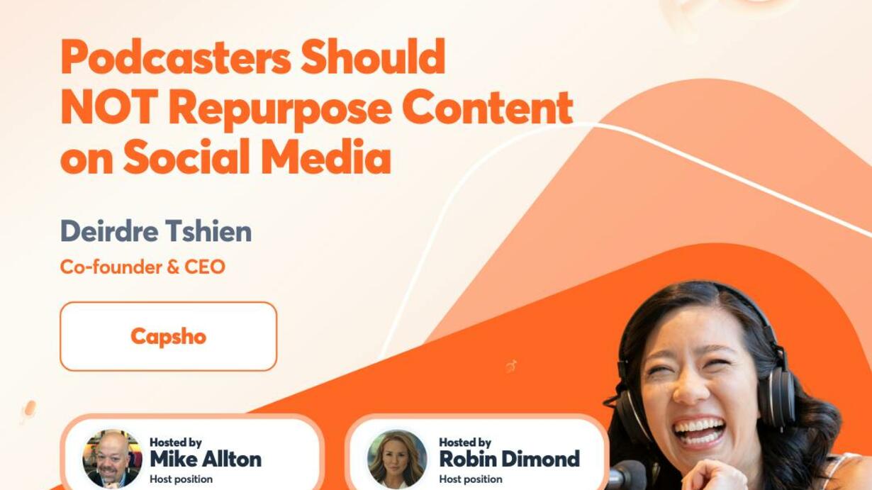 There are over 5 million podcasts in the world, and over 500 million people listen to them. But getting your podcast in front of those people is the challenge, isn’t it? How should you promote your podcast or your client’s podcast? And how are you supposed to position and frame your podcast so that it drives actual business results? That’s what Deirdre Tshien is here to help us with. She’s a serial entrepreneur who lives and breathes content marketing, particularly podcasting, having authored “Honey Trap Marketing” and host of Win the Content Game. Deirdre is a 2023 Honoree of the 100 Women to KNOW in America and has co-founded Capsho, an AI-powered content marketing solution that helps businesses and creators leverage their content to amplify their message, grow their listeners, and build their movements! The MarTech Show hosts Robin Dimond and Mike Allton talked to Deirdre about: 🔶 How agencies & social media managers can leverage podcast content 🔶 Why so much “common knowledge” on podcasting and repurposing is wrong 🔶 What marketers should focus on to get real results from podcasting Learn more about Deirdre Tshien Connect with Deirdre Tshien on LinkedIn Resources & Brands mentioned in this episode Capsho Subscribe to the show calendar: agorapulse.com/calendar Learn more about Agorapulse with a free demo Join the Social Media Pulse Community Show Notes & Transcript: https://www.agorapulse.com/blog/the-martech-show-episode-6/ Brought to you by Agorapulse: the #1 rated social media management solution. Produced and Hosted by Mike Allton, Head of Strategic Partnerships at Agorapulse, alongside Robin Dimond, CEO and Founder of Fifth & Cor. If you’re interested in seeing your marketing technology solution featured on an upcoming episode, reach out to Mike. Learn more about your ad choices. Visit megaphone.fm/adchoices