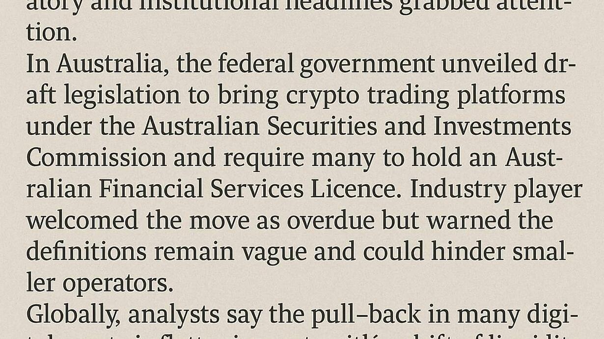 ⚡ The key takeaway for Aussie investors: regulation is tightening, major coins are steady, and volatility is here to stay.