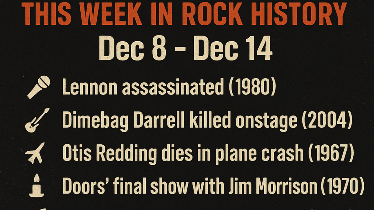 This week in rock history is one of the most emotional of the year. December 8 marks both the assassination of John Lennon and the onstage murder of Dimebag Darrell — two tragedies that shook music forever. Otis Redding’s final flight, the Doors’ last concert with Jim Morrison, and Bowie’s release of Young Americans round out a powerful week. Plus, we celebrate huge birthdays including Jim Morrison, Gregg Allman, Phil Collen, Corey Taylor, Dickey Betts, and more.