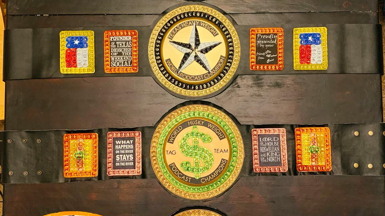 Rules: Only one vote/entry per person. US residents only. Contest will be open for a period of time specified by The Weekend Social Podcast— the timeline will be updated on the.WeekendSocialPodcast.com and drawing date will be announced 14 days in advance. Winner will be contacted by email (or phone if provided) and Chisler will work with winner to customize their podcast championship belt. Belt will take approximately 3-4 weeks to construct. No purchase necessary.