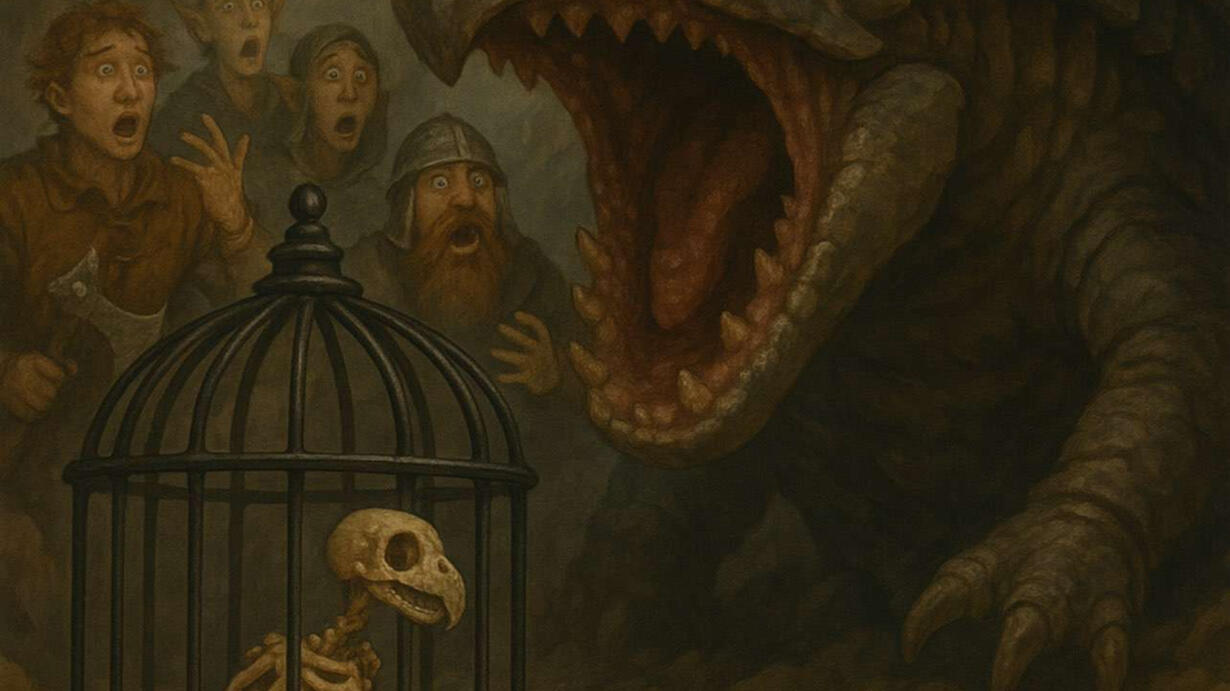 A hungry Bulette emerges from the earth of a large cavern, chomping down on the skeletal parrot and it's cage that Thom had thrown in as bait...