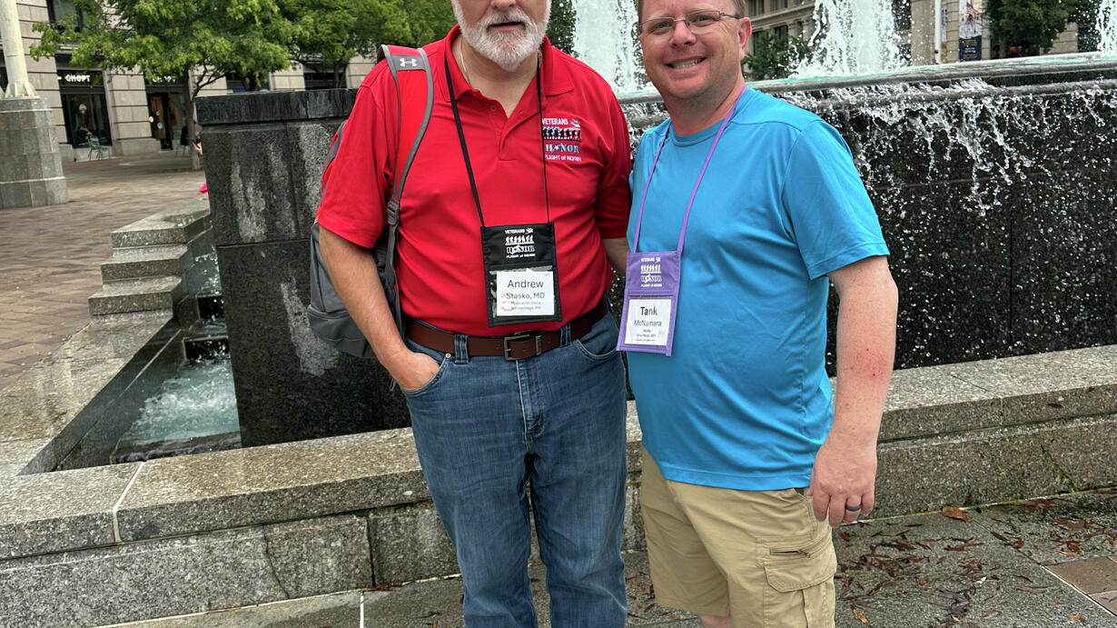 It takes an incredible team to make an Honor Flight possible, and this trip was no exception. From bus captains and medical staff to respiratory therapists, wheelchair assistants, and stair helpers, every volunteer played a vital role in creating a once-in-a-lifetime experience for our veterans. Among them was Dr. Andrew Stasko—a veteran himself—who served on the medical team. Near the end of the trip, Tank McNamara sat down with Dr. Stasko at the United States Navy Memorial to talk about his service and the medical team's role on the Honor Flight that helps keep the veterans safe.
