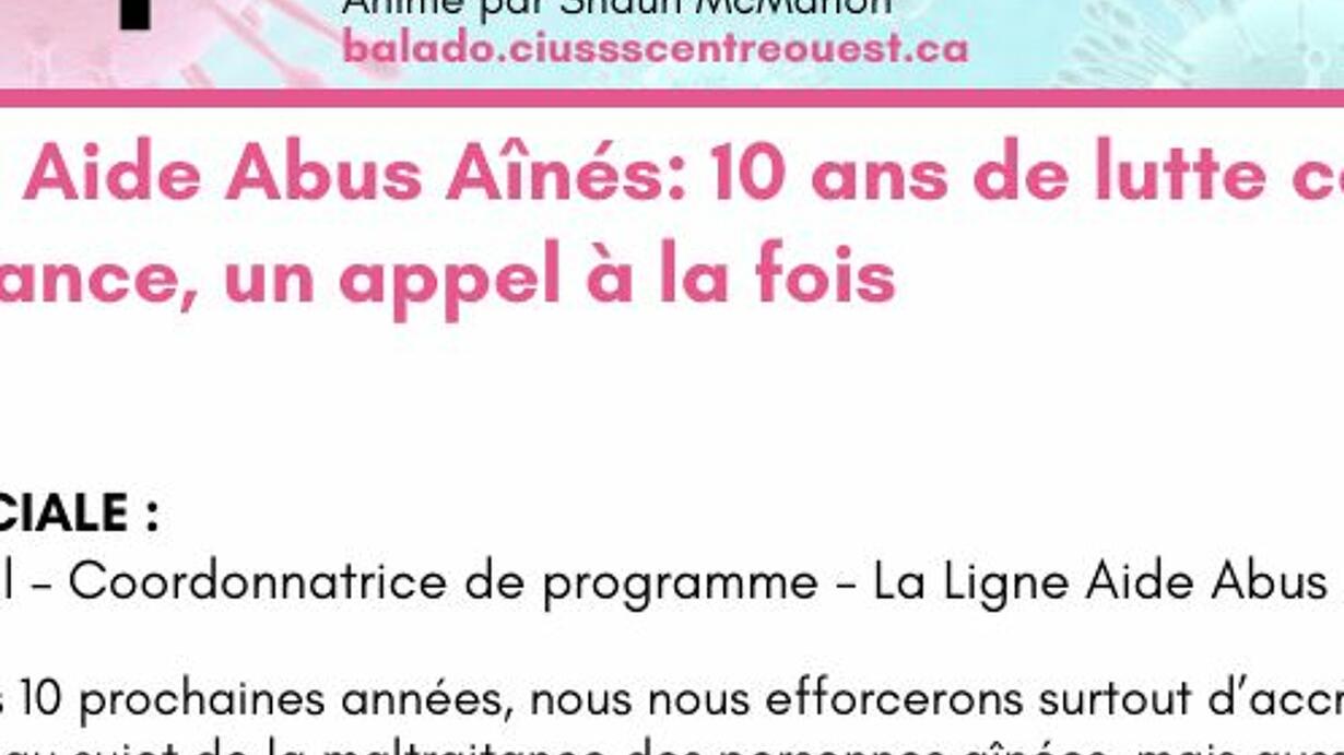 Le 1er octobre est la Journée nationale des aînés – Une journée qui souligne également le 10e anniversaire de la Ligne Aide Abus Aînés, l’un des trésors cachés du CIUSSS du Centre-Ouest-de-l’Île-de-Montréal. Au cours des dix dernières années, la Ligne Aide Abus Aînés s’est développée et elle continue de jouer un rôle particulièrement important pendant la pandémie de la COVID-19, en aidant à protéger les personnes âgées vulnérables à l’échelle de la province. Rachel Thadal, coordinatrice de programme auprès de la Ligne Aide Abus Aînés, rencontre Shaun McMahon dans le cadre de l’épisode le plus récent du balado Votre santé.La Ligne Aide Abus Aînés offre un service gratuit, confidentiel et bilingue, de 8 h à 20 h, sept jours sur sept. 1-888-489-2287 www.aideabusaines.ca