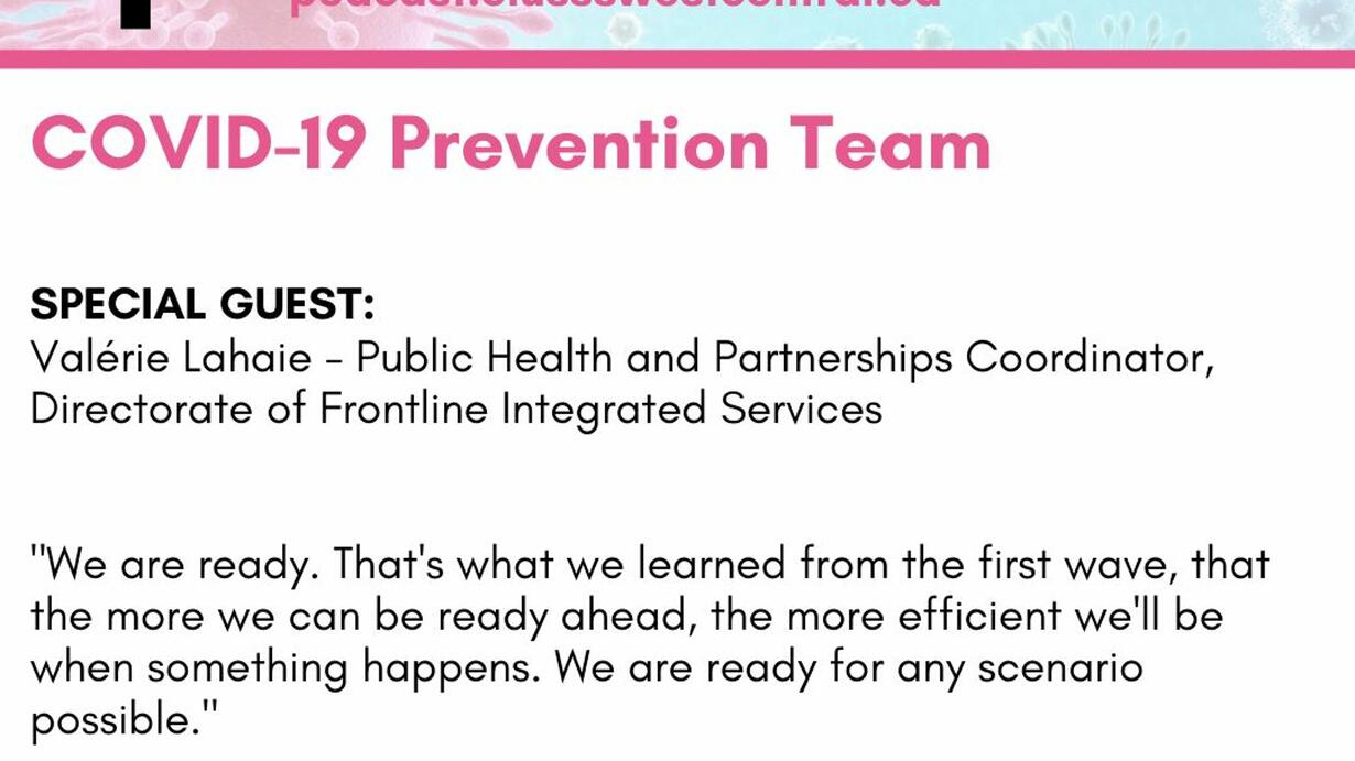 Masks, hand hygiene, social distancing...These are just some of the elements that our new COVID-19 Prevention Team verifies with partners throughout our area — including day camps, schools, day care centres, community organizations and more — to help prevent the spread of the virus. But what happens when a COVID-positive case is reported? What if there's an outbreak?Listen to the latest episode of Your Health with special guest Valérie Lahaie, Public Health and Partnerships Coordinator - Directorate of Frontline Integrated Services, to understand how the Prevention Team is dealing with a constantly moving target.