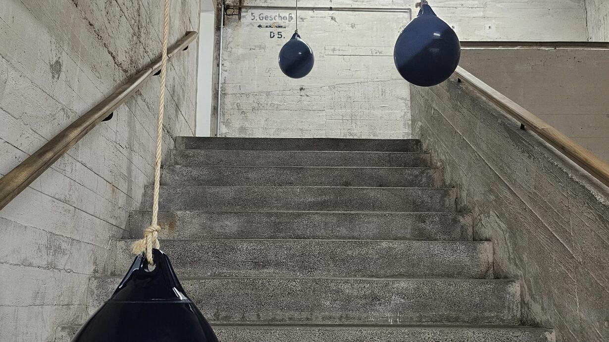 Inside the Boros Collection bunker, listening to a sound installation of distorted bells on a speaker suspended by chains, made by Eliza Douglas. The space has a fascinating past as a shelter, a prison for political prisoners, and a techno and sex club - and now it hosts a conceptual art exhibition. The sound captures both the muffled sounds of museum-goers on one side, and the passage of air and the sounds from Berlin outside on the other.