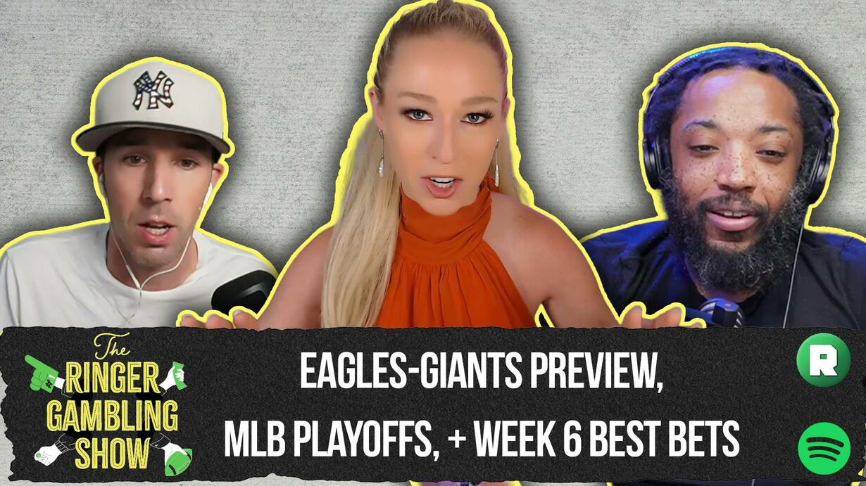 Ariel, JJ, and Raheem preview the Thursday-night NFL game, update and handicap the MLB playoff picture, and give out their Week 6 best bets in the NFL. -Eagles-Giants Preview (2:40)-MLB update (13:10)-Week 6 Best Bets (25:00)-Queen's Corner (40:40)-The Ringer 107 (46:06)-Best Bets (65:39) Hosts: Ariel Epstein, John Jastremski, Raheem PalmerProducers: Michael Szokoli, Stefan Anderson Follow Us On Instagram: https://www.instagram.com/ringergambling/Subscribe on YouTube: https://www.youtube.com/@ringergambling  The Ringer is committed to responsible gaming. Please visit www.rg-help.com to learn more about the resources and helplines available. Learn more about your ad choices. Visit podcastchoices.com/adchoices