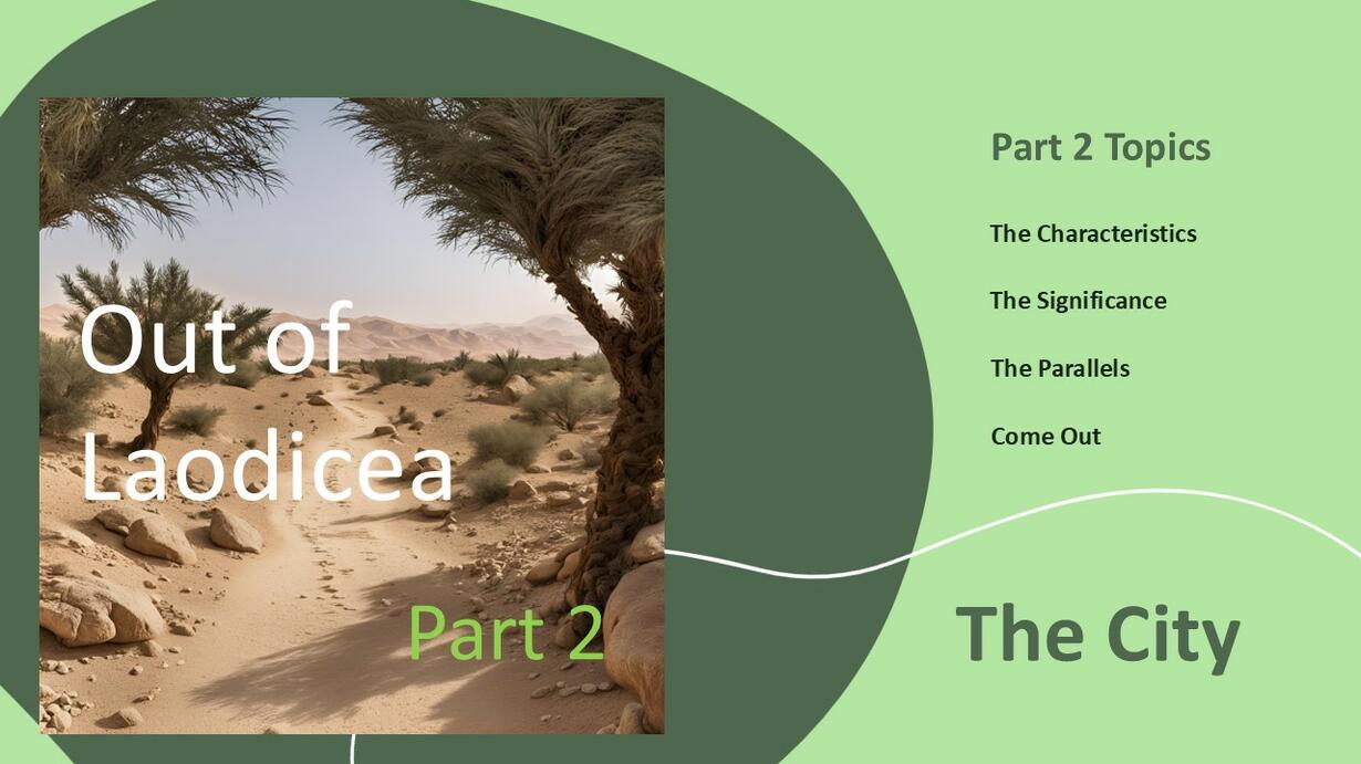 A look at the historical city and the spiritual condition of Laodicea. We will consider The Ekklesia, The City, The Letter, and Come Out. Questions to ask ourselves: 1. Have I surrendered all to Christ and received true salvation? 2. Am I existing in a state of self-deception? 3. What fruit is seen by my works? 4. Am I willing to humble myself, repent, and follow Christ?