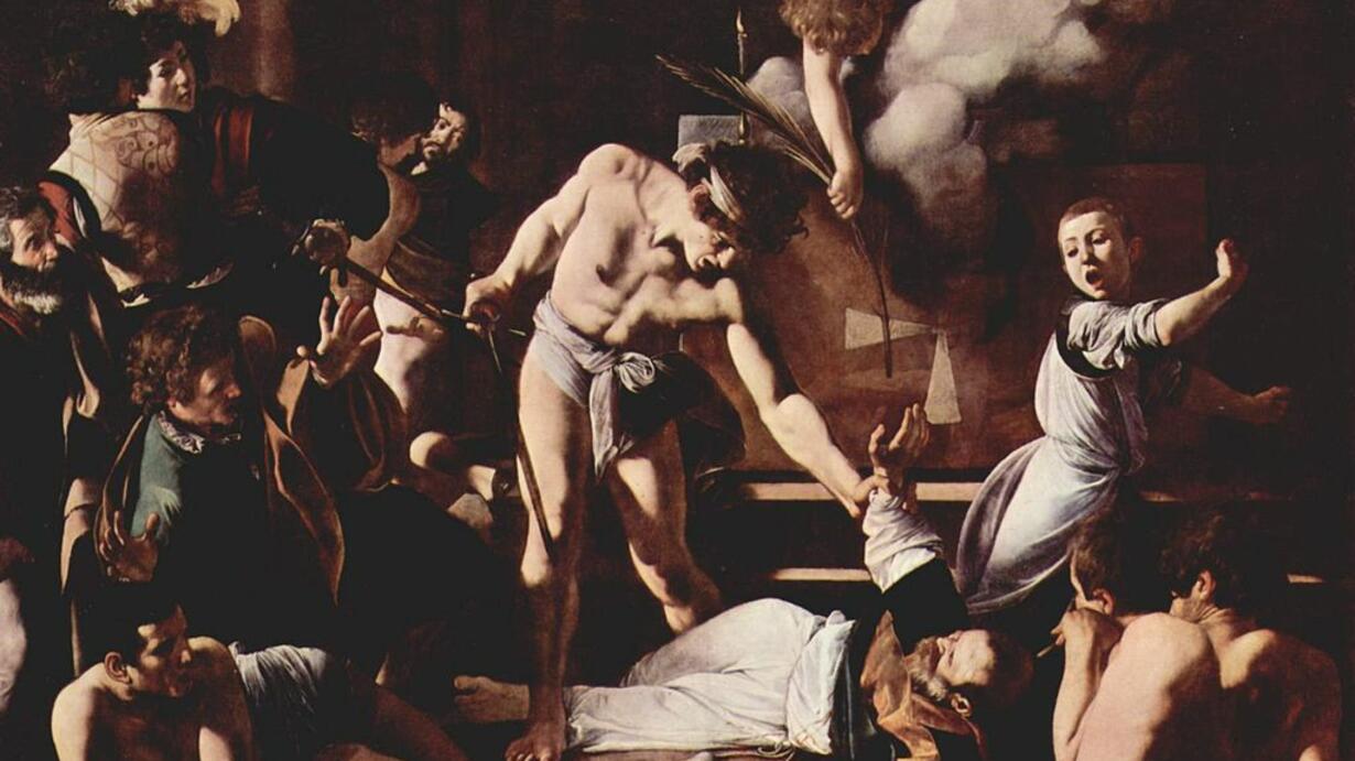 To jeden z cyklu trzech obrazów dotyczących żywota świętego apostoła, namalowany na zlecenie kardynała Matea Contreilego do kaplicy kościoła św. Ludwika Króla Francji w Rzymie. Bohater obrazu – Mateusz ukazany w kapłańskich szatach, pada na schodkach prezbiterium tuż przy widocznej mensie ołtarzowej , gdzie jeszcze przed chwilą sprawował eucharystię. Napastnikiem jest półnagi mężczyzna – poganin. Scenie przyglądają się przerażeni uczestnicy mszy św. O tym, że scena ta, zatrzymana niczym w fotograficznym kadrze, zakończy się śmiercią apostoła, świadczy pojawiający się anioł, który wciska w otwartą dłoń Mateusza palmę męczeństwa.