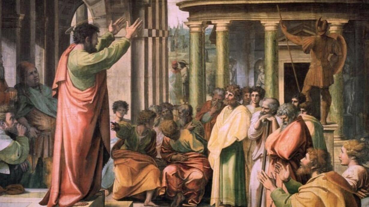 Temat zaczerpnięty z Dziejów Apostolskich. Paweł przed trybunałem greckim, pilnującym czystości i poziomu głoszonej nauki i religii, na wzgórzu Aresa głosi Ateńczykom Boga, w którym wszyscy żyjemy, poruszamy się i jesteśmy oraz dobrą nowinę o zmartwychwstaniu. Wśród słuchających Pawła Rafael bardzo wyraźnie wyodrębnił trzy grupy postaci.