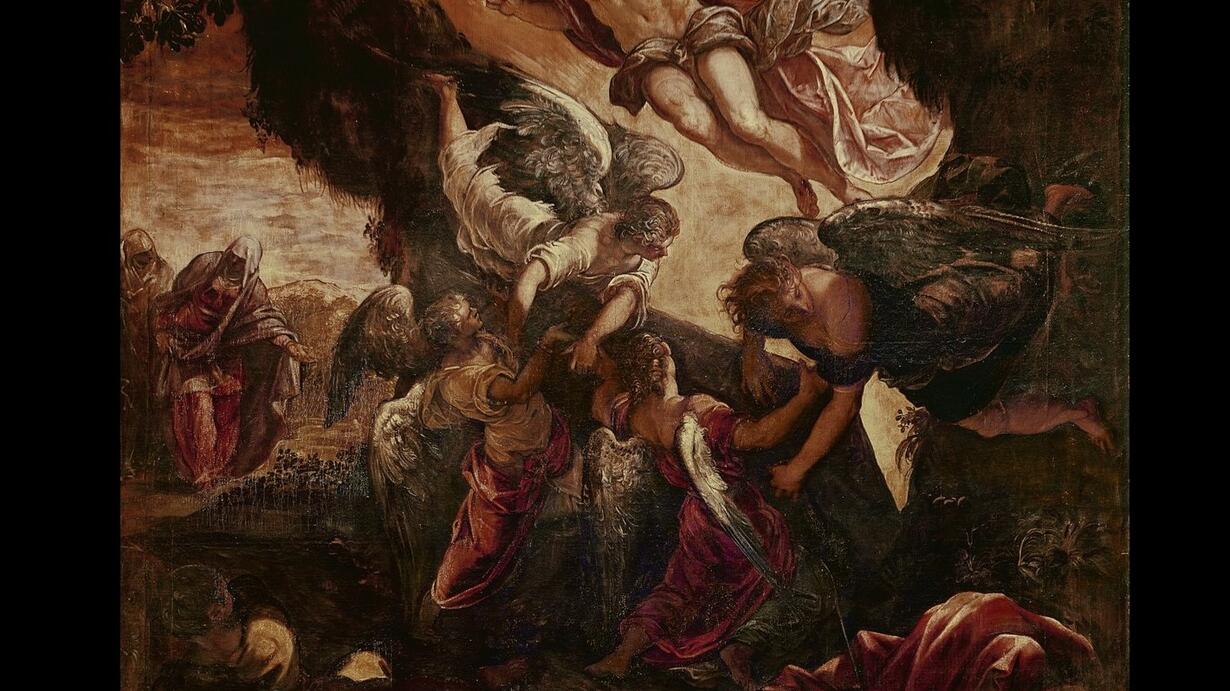 Osnute tajemnicą, odbywające się w ciemności i ciszy ogrodu Zmartwychwstanie Jezusa, w obrazie weneckiego mistrza wypełnione jest jednocześnie siłą eksplozji oraz zdumienia. Kompozycja sprawia, że gubimy się nie czując pionu ani poziomu. Nad naszymi głowami unosi się, ukazany w skrótach perspektywicznych Chrystus, z szatami rozpostartymi niczym skrzydła anioła. Światłość wydobywająca się spod unoszonego przez aniołów wieka grobu zaskakuje uśpionych żołnierzy. Z dala, o brzasku poranka, do ogrodu zbliżają się kobiety.