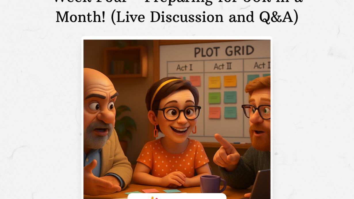 Each week during the challenge, we go live to: Answer your questions Troubleshoot common writing roadblocks Share tips to help you plan, draft, and finish your novel Highlight upcoming challenge events and writing sprints