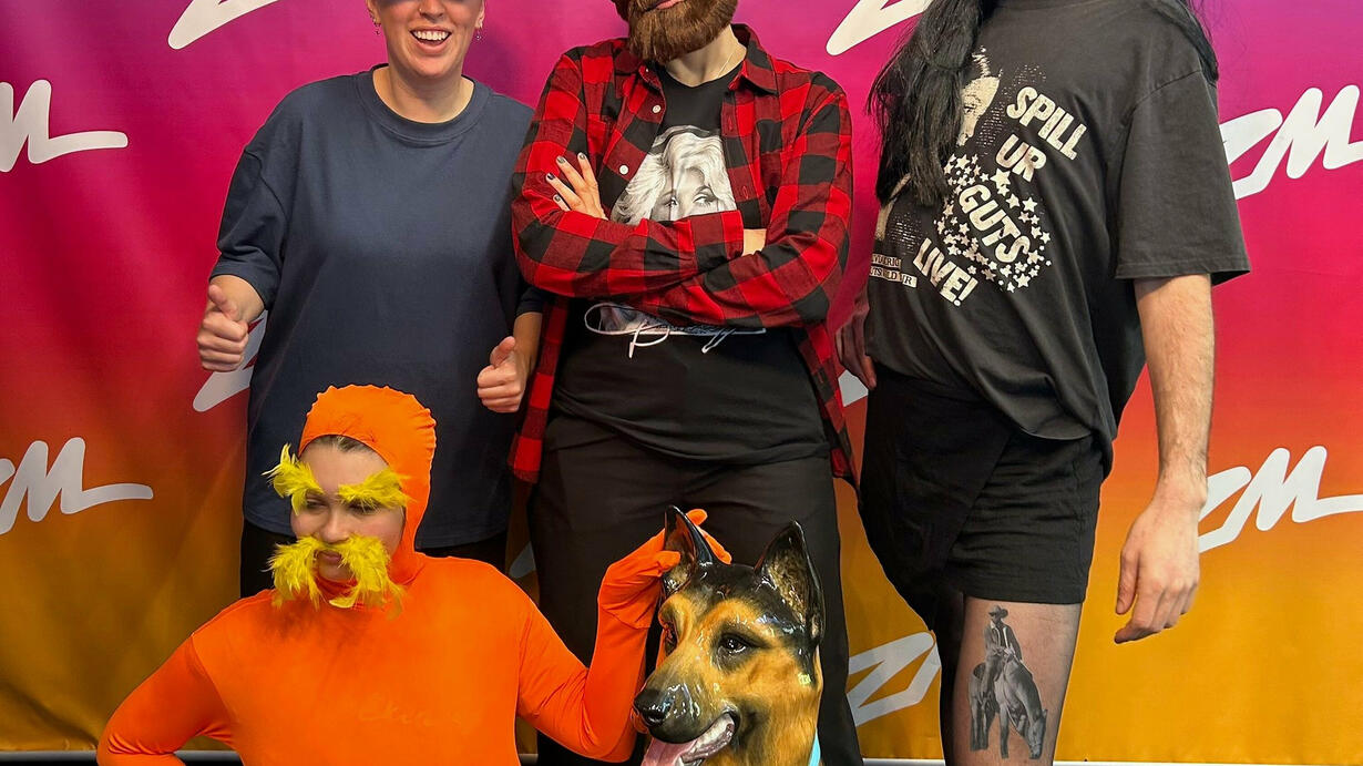 we're currently dressed as Flitchborne and Hailey from Zidim's Morning Show,