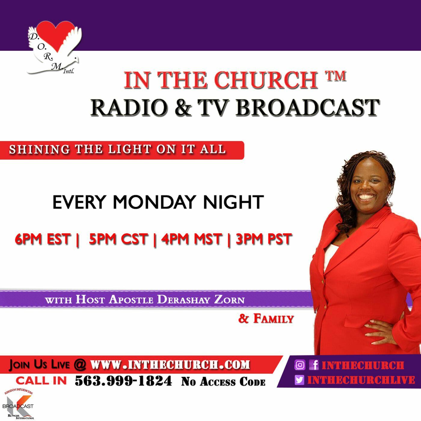“In The Church” is a live, two-hour weekly talk show from D.O.R.M International that is produced every Monday night from 6:00pm – 8:00pm featuring Host/Moderator Apostle Derashay Zorn and friends. It is the platform in which they will shine the light of God’s word “In the Church” to discuss and resolve real everyday issues that are taking place around the world exposes the good, the bad and the ugly. They will engage in a powerful conversation where they will share their opinion, expertise and reveal the truth in God’s word on every topic imaginable. The hosts will engage the audience in the discussion by taking live callers and interacting with comments, questions, and prayer. “In the Church” broadcast in HD Internet Live Streaming Internet Radio, and is available every Monday night from 6:00pm – 8:00pm to hear live go to www.inthechurch.com . “In The Church” is owned by D.O.R.M International