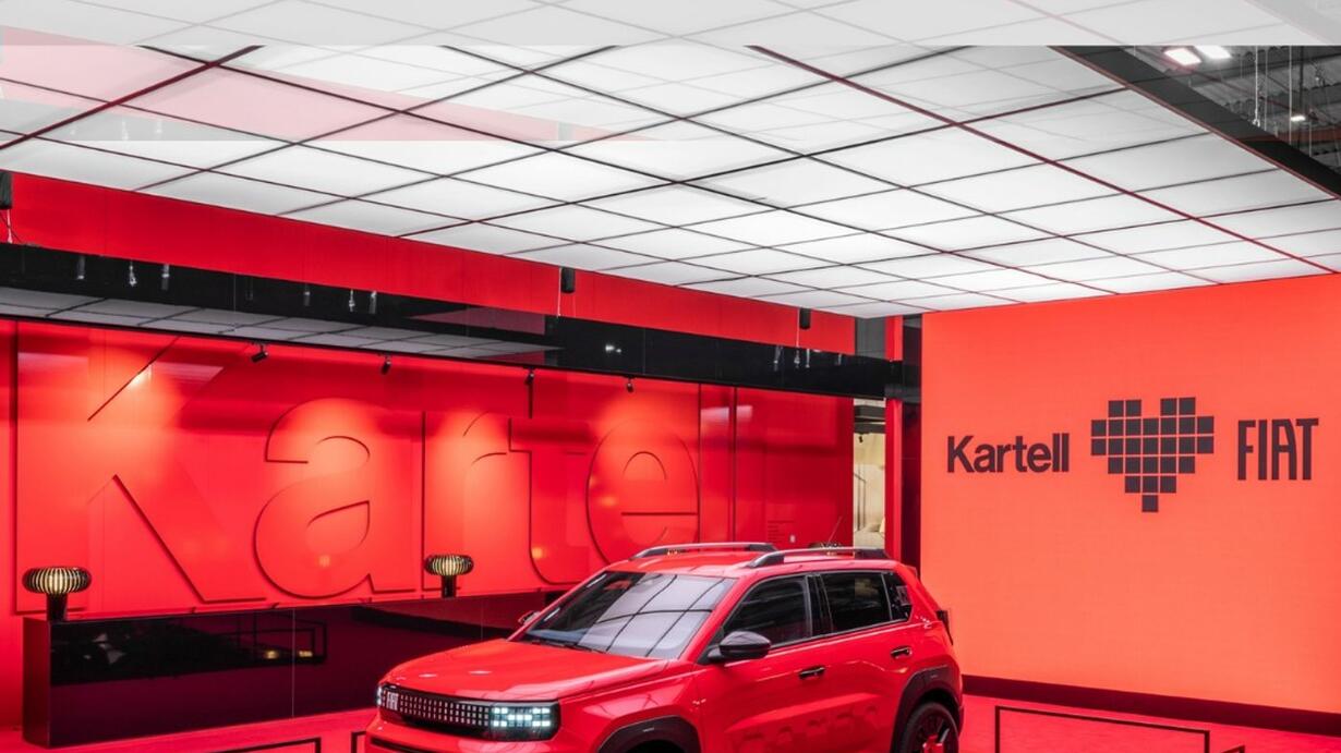 "FIAT Grande Panda Kartell" al centro dello stand del Salone del Mobile: un work in progress, un laboratorio creativo su cui i due marchi, Kartell e Fiat, hanno lavorato insieme per arrivare a una versione ancora da finalizzare, ma carica di significati e di carattere.