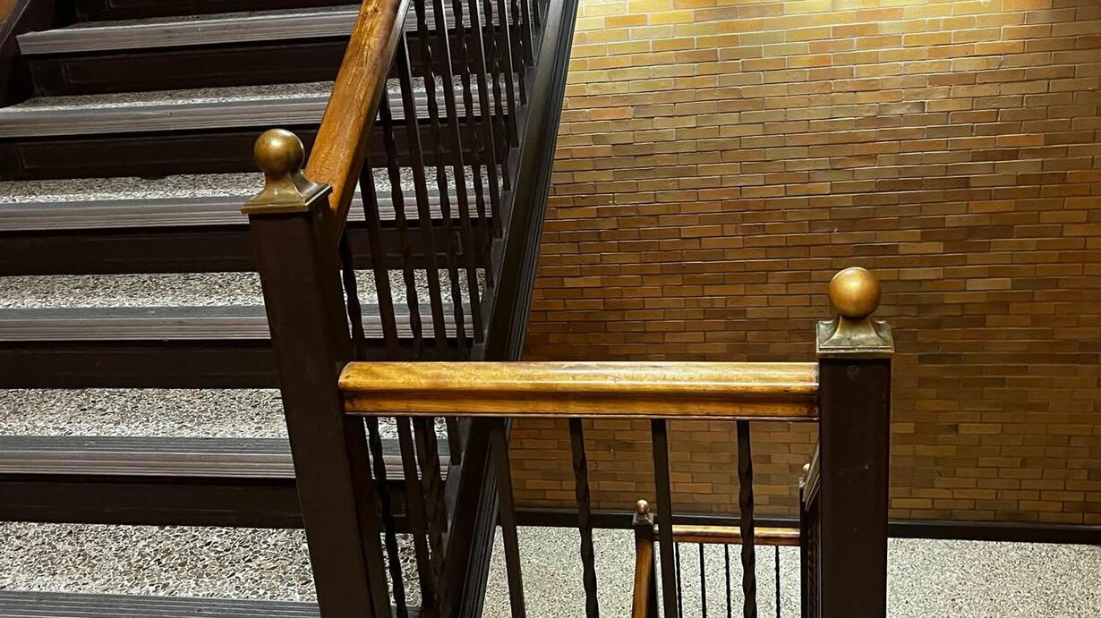 This is an intense one. It is the sound of a long, long stairwell and a vibrant hallway. No people in the scene except for the sounds of echoes through a hallway in an old university.