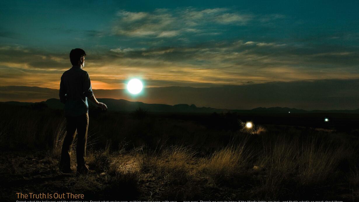 In Texas, Friday night lights herald the local high school football games and that's when life really begins in small town Texas. In West Texas, there are other lights- much more mysterious lights, which have been spotted in the mountains outside of Marfa, Texas, for over 100 years. These are called The Marfa Lights, and they are the subject of lots of stories and urban legends. This is the story of the Marfa Lights.