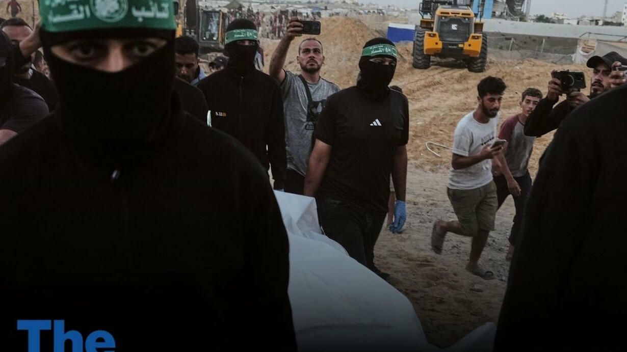 Illustrative image: Hamas terrorists carry a white bag believed to contain a body, after retrieving it from a tunnel during a search for the remains of hostages in Hamad City, Khan Younis, in southern Gaza, October 28, 2025. (AP Photo/Jehad Alshrafi)