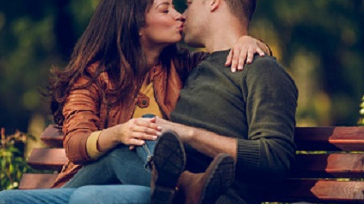 man and woman sitting on a bench kissing passionately. Mike