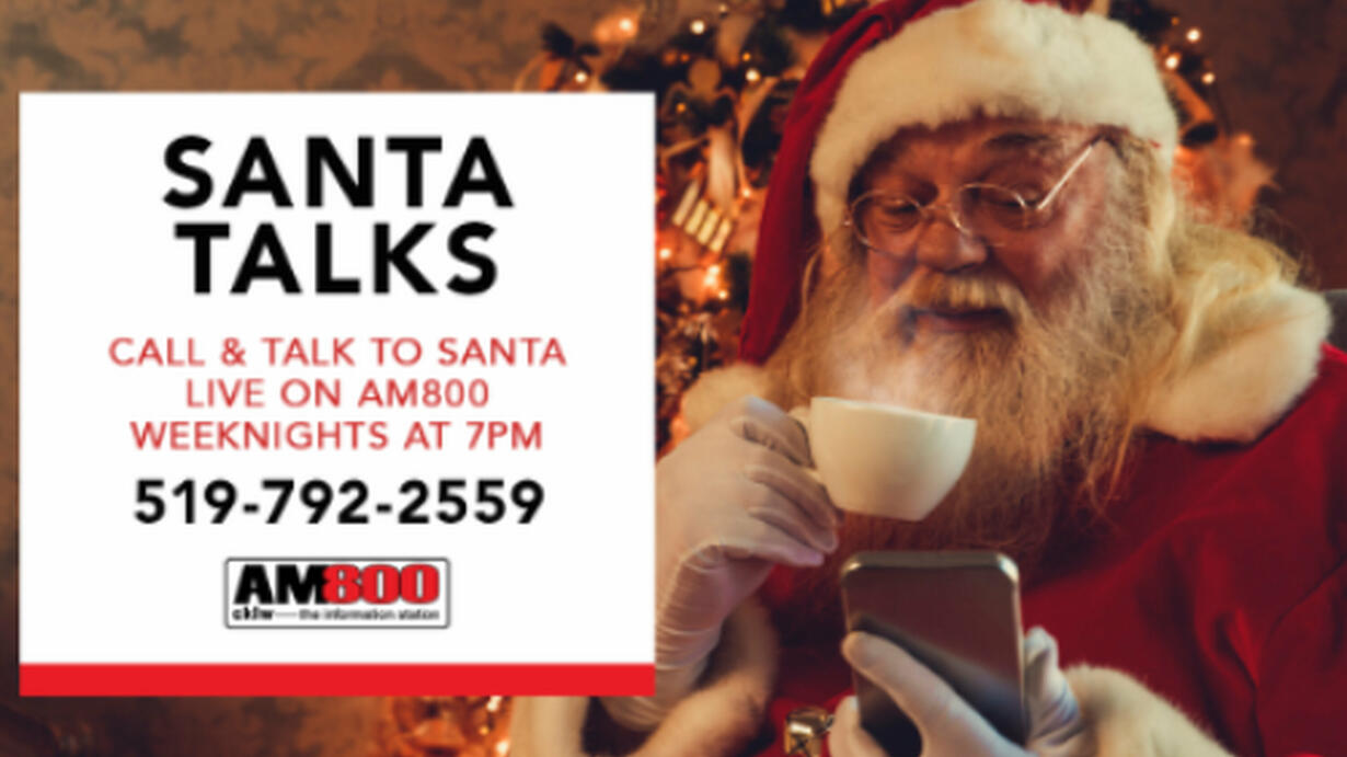 Santa Talks stats tonight.  You can call Santa and let him know everything on your list. Weeknights from 7 ‘til 8 you can call 519-792-2559 to talk to Santa.