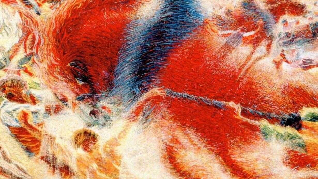 La tecnica divisionista, il tratto di Munch, le suggestioni simboliste, le sculture di Medardo Rosso, l’incontro con il Cubismo e il pensiero del filosofo Bergson, costituiscono per Boccioni gli ingredienti fondamentali della sua evoluzione artistica, mentre luoghi e figure ricorrenti quali ad esempio la periferia di Milano, il cavallo, la madre, lo interessano in quanto pretesti per rappresentare la forza vitale del dinamismo, sempre più inteso come un flusso continuo e universale che coinvolge tutto, anche gli oggetti statici. La compenetrazione del soggetto con lo spazio circostante e l’unificazione atmosferica degli elementi sono le vie attraverso le quali l’artista reggino giunge a sintetizzare il movimento, tanto nella pittura quanto nella scultura.