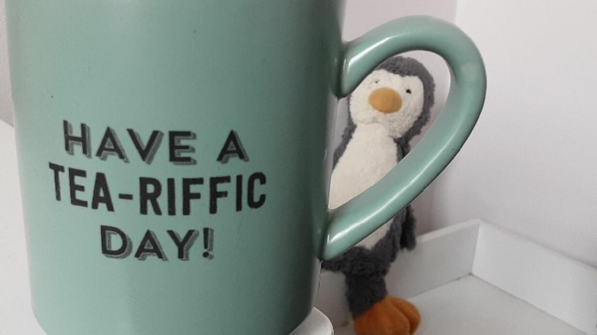 Drinking an early morning cup of tea and eating a fancy biscuit.
