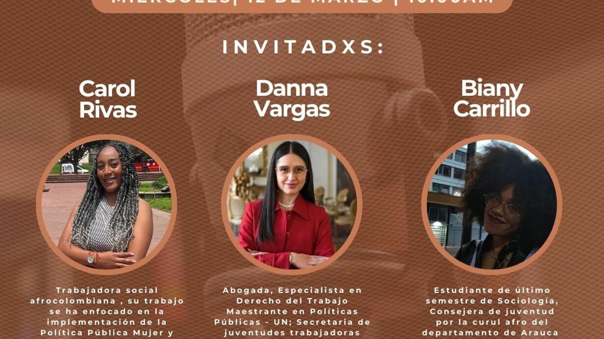 Para hablar al respecto nos acompaña: Carol Rivas; Trabajadora social afrocolombiana , su trabajo se ha enfocado en la implementación de la Política Pública Mujer y Equidad de Género (PPMYEG). Danna Vargas; Abogada, Especialista en Derecho del Trabajo, Secretaria de juventudes trabajadoras CGT y Biany Carrillo; estudiante de último semestre de Sociología, Consejera de juventud por la curul afro del departamento de Arauca .