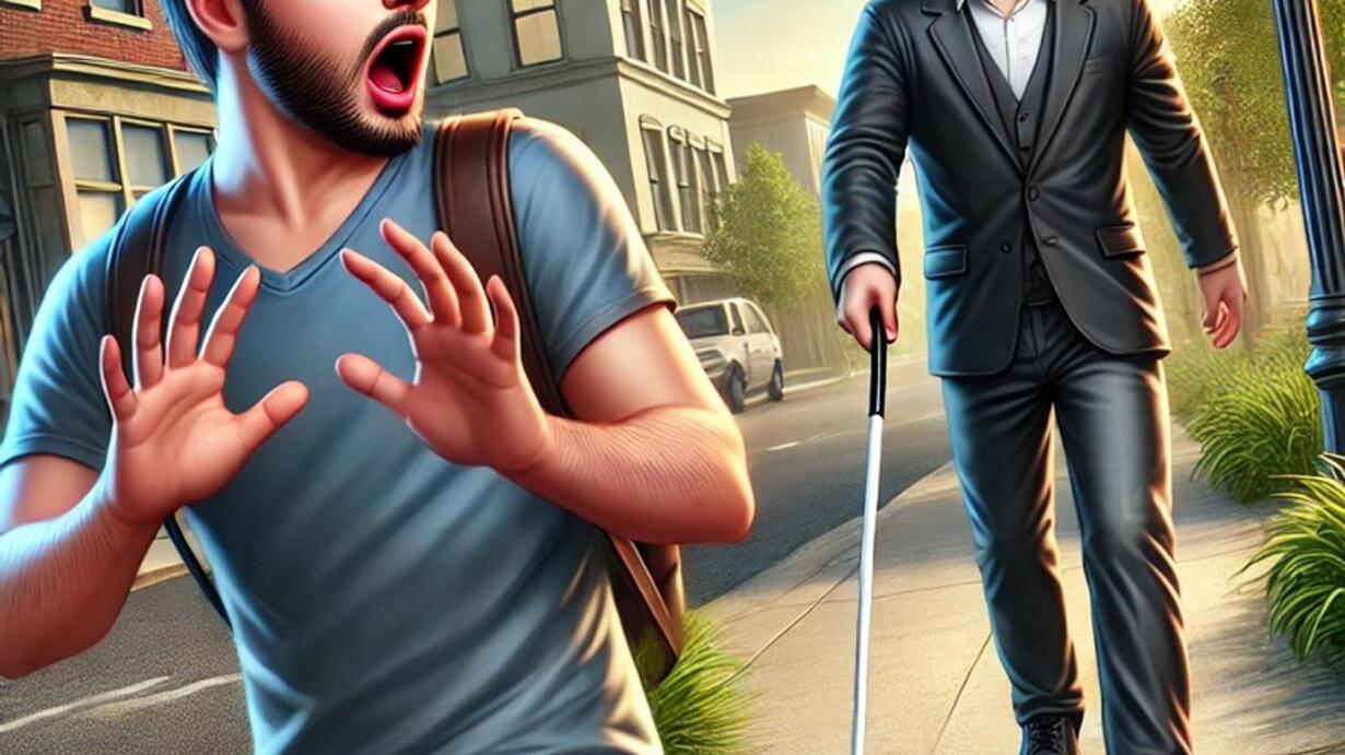 #PraTodosVerem A imagem é uma ilustração que mostra duas pessoas em uma calçada. À esquerda, há um homem jovem com barba, cabelo escuro e óculos escuros, vestindo uma camiseta azul e calça jeans. Ele parece surpreso ou assustado, com a boca aberta e as mãos levantadas. À direita, há um homem mais velho, também usando óculos escuros, vestindo um terno cinza e camisa branca. Ele está segurando uma bengala branca, indicando que é uma pessoa cega.