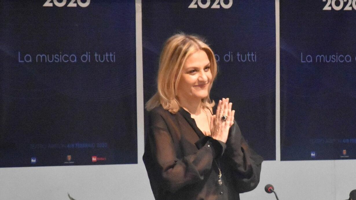 Antonio Pernarella intervista Irene Grandi durante la conferenza stampa nella sala 'Lucio Dalla' al Teatro Palafiori di Sanremo